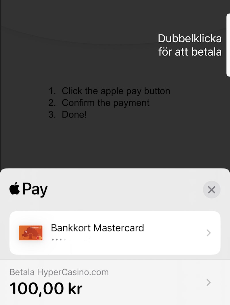 I exemplet nedanför visar vi hur du gör när du ska använda Apple Pay för insättning hos Hyper Casino.