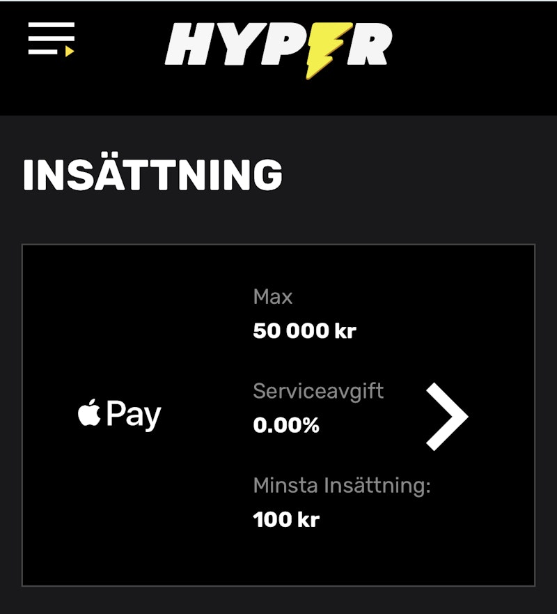 Vid insättning väljer du Apple Pay som betalningsmetod för din insättning. Där kan du tydligt också se hur mycket du kan sätta in och vilka avgifter det är. os Hyper Casino handlar det om mellan 100 kr till 50.000 kr som gräns för insättning och inga avgifter.