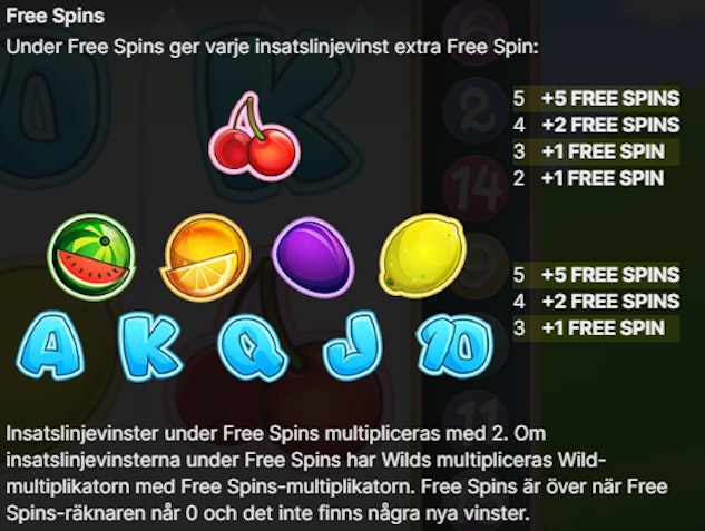 Det kan dyka upp freespins i Fruit Shop. Allt ifrån 1-5 gratissnurr. Ingen enskild symbol aktiverar free spins, utan näst intill samtliga symboler kan aktivera dessa.